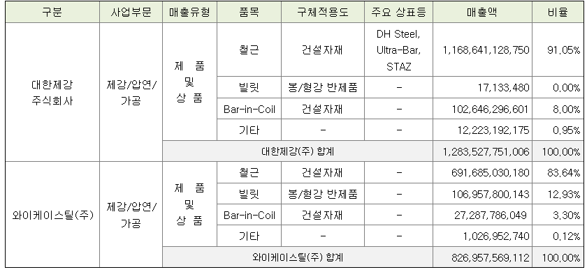 연결회사는 철근의 제조,판매를 주 업으로 하고있으며 물류 매출, 고철 및 비철 상품매출 또한 발생하고 있습니다. 전체 연결 매출의 95%이상을 철근 제조, 판매부문에서 발생하고 있어 해당 사업부문과 이 외 기타 사업부문으로 구분하여 아래와 같이 주요 제품을 요약합니다.