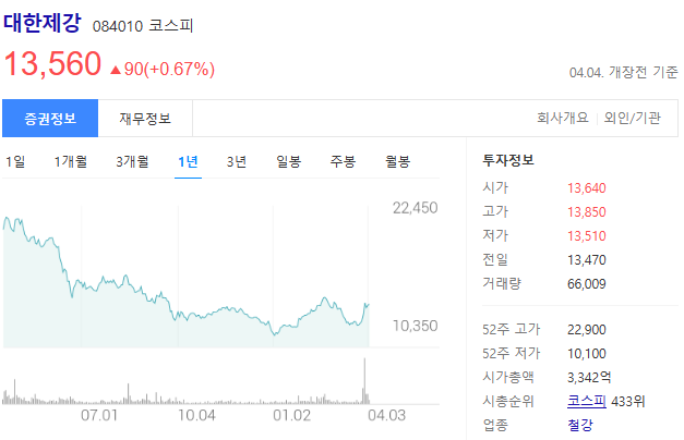대한제강 주가는 13560원이다.
