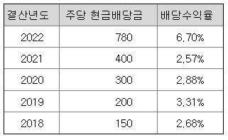 2021년은 400원, 2020년은 300원을 배당을 해 오고 있으며, 계속해서 배당금은 늘려가고 있다.