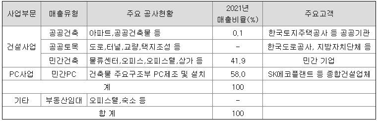 건설사업 부문은 주로 지식산업센터, 오피스텔, 상가, 공동주택 등을 시공해 왔으며, 현재 40~50% 매출비중에서 점차 확대될 것으로 전망하고 있습니다.