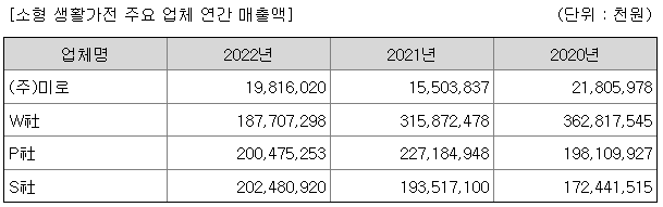 생활가전을 취급하는 기업들의 2022년 매출 증감율을 보면 W社 ,P社 ,S는 社 모두 전년대비 마이너스 성장율을 보이고 있습니다. (미로의 2022년 매출액은 전년 대비 28% 증가 하였습니다.) 이는 미로의 시장점유율을 추론할 수 있는 자료입니다. 다만 앞서 설명한대로 소형 생활가전시장에 대한 객관적인 자료가 없어 구체적인 시장 점유율은 제시하기 어렵습니다.