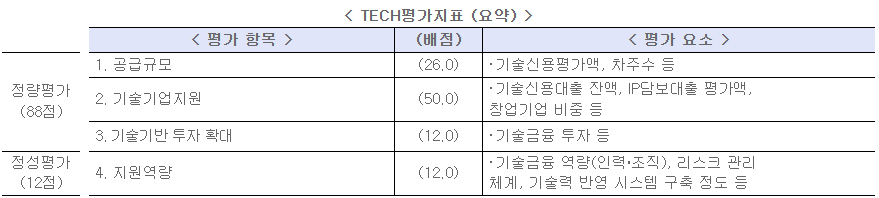 은행 간 공정경쟁 환경 확보 및 혁신분야 자금공급 확대를 위해 개정된 TECH 평가지표 ’22년 상반기 실적에 대한 평가부터 적용됩니다.