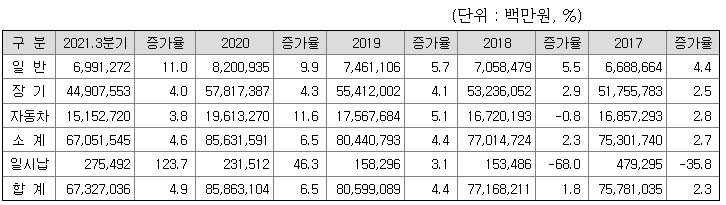 지난 5년간 현대해상을 포함한 손해보험업계 전체의 원수보험료 실적 및 성장율은 아래와 같습니다.